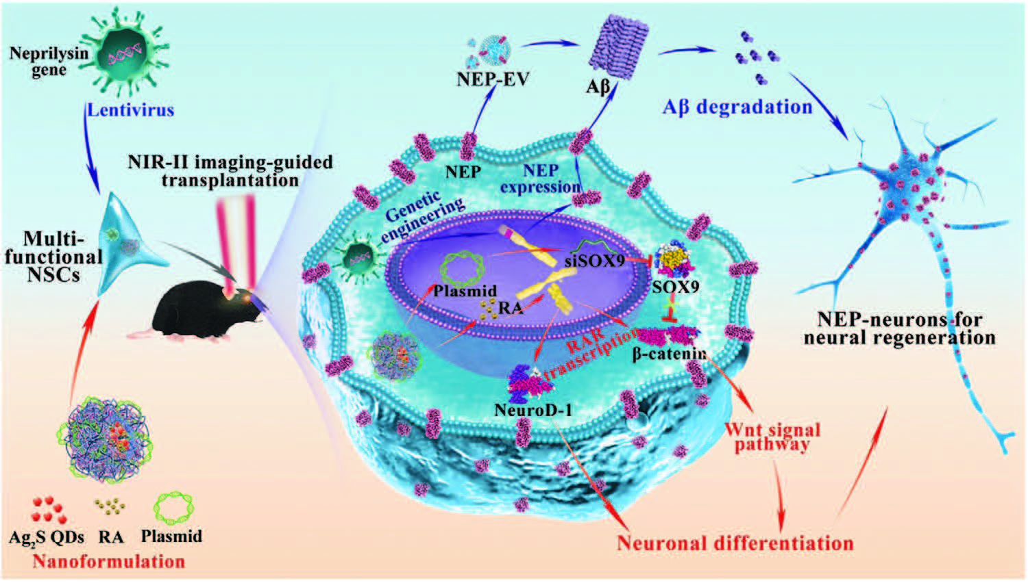 他們開發(fā)了一種神經(jīng)干細(xì)胞能夠穩(wěn)定和持續(xù)表達(dá)neprilysin (NEP)的基因工程化神經(jīng)干細(xì)胞以增強(qiáng)大腦中的Aβ降解和神經(jīng)干細(xì)胞存活情況,構(gòu)建了一種具有高基因/藥物遞送性的納米制劑,以克服與微環(huán)境相關(guān)的不利影響并促進(jìn)NEP表達(dá)的神經(jīng)干細(xì)胞的神經(jīng)元分化。實(shí)驗(yàn)結(jié)果表明,基于Ag2S量子點(diǎn)的熒光成像可以對(duì)神經(jīng)干細(xì)胞移植進(jìn)行實(shí)時(shí)指導(dǎo)。該策略具有諸多優(yōu)點(diǎn),包括有效和持久的Aβ降解、改善神經(jīng)再生和精確細(xì)胞移植。研究表明使用該療法可以實(shí)現(xiàn)記憶逆轉(zhuǎn)恢復(fù)和改善學(xué)習(xí)障礙的長期療效(6個(gè)月)。