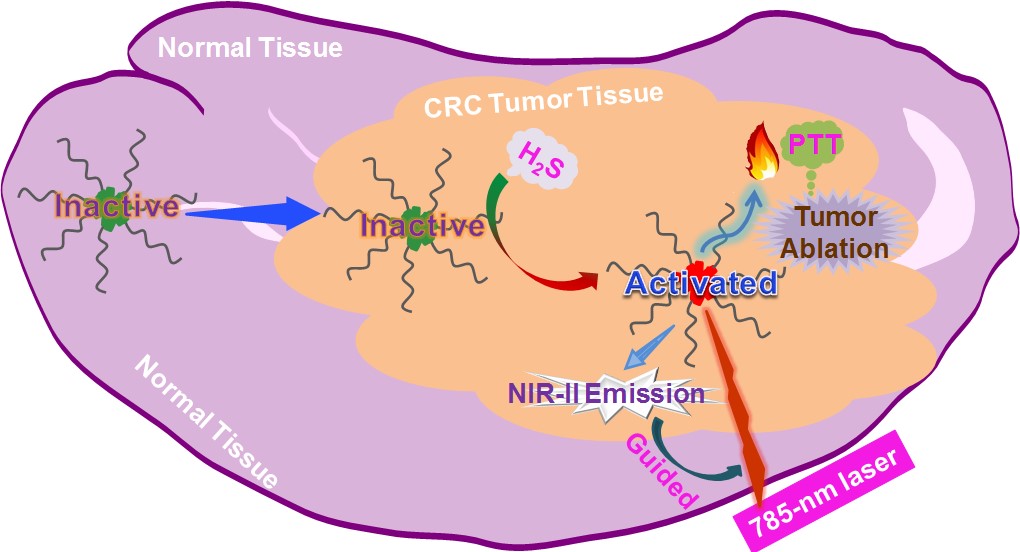 光熱治療是一種新型腫瘤治療方法,具有非侵入、過程簡單、正常組織損傷小等優點,能利用光熱材料將近紅外光轉化為熱,實現熱消融細胞。近紅外二區熒光劑對于癌癥的深部組織光熱治療具有很大的應用前景,但仍然受到光熱治療固有的非特異性和毒性的限制。針對這一問題,他們開發了一種硫化氫可特異性激活的納米材料,并產生光熱特性和近紅外二區熒光。研究表明,這種治療診斷納米光熱探針在富含硫化氫的腫瘤中被特異性激活,而在正常組織中是無功能的。納米光熱探針的激活不僅能發射具有比常規熒光探針更深組織穿透能力的近紅外二區熒光,而且產生高紅外吸收,導致在紅外激光照射下有效的光熱轉換。重要的是,通過在小鼠體內應用納米光熱探針試劑建立了近紅外二區成像引導的腸癌的光熱治療,使腫瘤完全消退,非特異性損傷最小。因此,他們的研究對腫瘤的精準診療具有非常重大的意義。