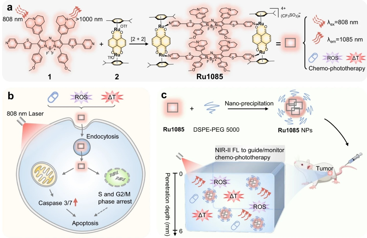華中師范大學化學學院孫耀教授課題組在近紅外二區熒光活體分析領域取得了新進展。盡管以Ru(II)為基礎的藥物有望取代pt藥物,但其體內生物醫學應用仍受激發/發射波長短和治療效果不理想的限制。孫耀教授課題組合理設計了激發波長808 nm,發射波長超過1000 nm的Ru(II)金屬環,即Ru1085。該金屬環具有較深的光透性(高達6 mm),能增強化學光療活性。體外的性能測試結果表明,Ru1085對各種癌細胞株,尤其是對順鉑耐藥的A549細胞具有顯著的細胞攝取和良好的抗癌能力。進一步的研究表明,Ru1085能夠有效地發揮其自身的光療-化療的聯合治療性能,打開細胞凋亡通路,誘導癌細胞的死亡。基于上述性能優勢,Ru1085能夠顯示精確的NIR-II熒光成像引導,并通過熒光可視化技術長時間監測和評估腫瘤治療過程中的病理變化。該研究為今后發展生物醫學應用的超分子熒光試劑提供了新的設計思路。相關研究成果發表在自然通訊(NatureCommunications,2022)上,博士生徐玉玲和李崇錄為論文的共同第一作者,孫耀教授為最后通訊作者。